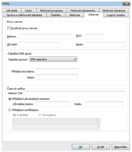 Doplňkové kartotéky zobrazovat v okně databází nahoře / dole - zobrazení třetí databáze buď v horní části obrazovky vedle databáze poplatníků nebo v dolní části vedle databáze dokumentů/vozidel/nemovitostí. Správa a zálohování databází... Nástroje, které jsou součástí této sekce slouží, jak již název napovídá, pro správu a zálohování databází. K použití těchto nástrojů je nutné, aby program v dané chvíli nepracoval s databázemi. K tomu slouží tlačítko ”Uzavřít okna databází”. Správa databází Záloha databází – vytvoří zálohu současných databází. Tato záloha se tvoří do souboru ve formátu archivu ZIP pod uživatelem vybraný název a cestu. Automatické zálohování databází Kartotéky - databáze - TaxEditu nenesou největší množství informací. Největší množství dat je v samotných dokumentech s přiznáními v souboru .PDW. Databáze jsou ale nejzranitelnější část dat. Když se z technických důvodů poškodí jeden jediný soubor se seznamem poplantíků nebo se seznamem dokumentů, všechna přiznání zůstanou nedotčena. Ale, přehled poplatníků a jejich přiznání je v jediném okamžiku ztracen a rekonstrukce seznamů nesmírně pracné. Proto jsou kartotéky pravidelně zálohovány v rámci aplikace. Jen je nutné si uvědomit, že zálohování kartoték v žádném případě nazálohuje vlastní dokumenty. Zálohování všech dat, které je ovšem podstatně časově náročnější, se provádí v Nástroje/Externí nástroje/Export... Automatické zálohování databáze znamená, že v uživatelem určeném adresáři vznikne archiv ZIP se zálohou současného stavu všech databází, ke kterému se později při případných problémech můžete vrátit. V archivu ZIP je uložen XML soubor s kompletní zálohou. Všechny akce v této sekci pracují se ZIP soubory v adresáři určeném v poli Adresář pro soubory záloh. Automaticky zálohovat kartotéky při startu – zapne se automatické zálohování databází, které bude zálohy provádět podle dále nastavených parametrů při startu programu. Může být obtěžující v okamžiku, kdy po spuštění potřebuje uživatel rychle provést nějakou akci v TaxEditu. Proto existuje ještě druhá možnost; Povolit zrušení souborů automatické zálohy… - automaticky se budou mazat zálohy databází, které jsou starší než uživatelem specifikovaná doba. Maximální počet souborů udržovaných v záložním adresáři by mohl být nebezpečný parametr. Kdyby se například při řešení nějakého problému vytvořil velký počet záložních souborů již s chybnými daty, parametr minimálního stáří způsobí, že v adresáři zůstane více než maximum souborů, zato ale některé s rozumnými daty. Číselníky... Databáze číselníků jsou částečně naplněny již od výrobce programu. Většinu hodnot je ale možné upravovat, údaje je možné do číselníků přidávat i je z nich mazat. Správa se provádí na záložce ”Číselníky” (nabídka Nástroje volba Číselníky) Jednotlivé číselníky se volí v seznamu v horní části. Ve spodním seznamu se ve standardním databázovém okně zobrazuje obsah číselníku. Ten je možné řadit podle jednotlivých sloupců klepnutím na jejich záhlaví. Šířky sloupců je možné měnit tažením předělu jejich.záhlaví. Každý řádek je možné smazat, přesunout o pozici výše či níže, na konec či na začátek seznamu. Hodnoty se upravují přímo v řádcích seznamu. Klepnutím myši do textu se aktivuje editační režim. Změna hodnoty se potvrdí stiskem ENTER, stiskem ESC je možné vrátit se k původní hodnotě. Klávesou TAB je možné přejít k editaci dalšího sloupce. Některé řádky není možné upravovat. S jejich přednastavenými hodnotami počítá program v některých formulářích. Takové řádky jsou v číselnících zobrazeny šedě. Číselníky se ve formulářích a v oknech kartoték se volají klávesou F8, nebo volbou Nástroje/Zobraz plný číselník. Externí nástroje... Obnovit původní nastavení programu – po vyvolání této funkce se obnoví nastavení programu tak, jak bylo po instalaci. Export/Import – slouží k exportu/importu vybraných dat z/do programu TaxEdit. Pomocí ní lze snadno vybrat a přenést informace ve formátu ZIP nebo TXT z/do databází programu TaxEdit. Export všech dat do zálohy – provede export veškerých dat z programu TaxEdit do zálohového archivu. Import dat ze zálohy exportu – slouží k importu všech dat z exportu programu TaxEdit. Oprava databází – slouží k opravě poškozených databází programu TaxEdit. Po spuštění nástroje se provede rekonstrukce poškozených tabulek a vypíše se seznam nalezených a opravených chyb. Propojení na Money S3 – Pro usnadnění práce společným uživatelům aplikací TaxEdit a Money S3 jsme společně s Cígler Software a.s. přichystali mechanismus propojení, který umožní jednoduše transportovat data z jednotlivých agend Money S3 do příslušných dokumentů TaxEditu. Internet... Zde jsou shromážděna nastavení, která se týkají připojení k internetu a odesílání SMS. Nastavení na této záložce je určeno pro pokročilé správce. Případné změny můžete konzultovat s technickou podporou. Proxy server Pokud není zatrženo, použije se nastavení Proxy serveru z windows Odesílání SMS zpráv Odesílat SMS zprávy je možné pomocí služby SMS-operátor, ke které musíte být správným způsobem zaregistrování (viz https://www.sms-operator.cz) Časová razítka Nastavení adresy a přihlašovacích údajů serveru autority časových razítek pro odebírání kvalifikovaných časových razítek. Prohlížení logových záznamů... Zobrazí seznam událostí, které nastaly za dobu provozu programu TaxEdit (spuštění, ukončen