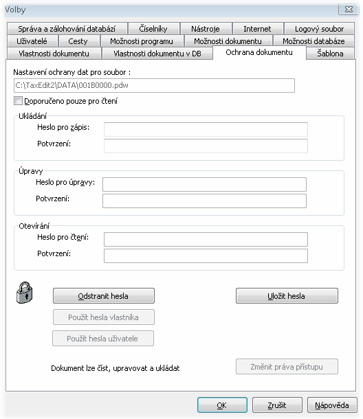 Při otevřeném dokumentu jsou dále uvedené funkce Uživatel programu až Kalkulátor uvedeny v podnabídce Volby. Při pohledu do nabídky odjinud, například z okna databází, jsou přímo v nabídce Nástroje. Uživatel programu... Je vhodné vyplnit detailní informace o uživateli nebo ve víceuživatelských verzích o uživatelích na kartě Uživatel programu. Tyto informace se doplňují do nově vzniklých formulářů do oddílů o daňovém poradci a do polí s kontaktem na autora přiznání. Již zavedení uživatelé jsou zobrazeni v seznamu v horní části okna. Po vybrání konkrétního řádku se zobrazí detaily uživatele v polích druhé části okna. Zde je možné všechny údaje upravovat. Nový uživatel se přidá stiskem stejnojmenného tlačítka. Uživatelů v TaxEditu může být zavedeno více. Každý uživatel může mít nastaveny různé druhy oprávnění. Základním a nejvyšším oprávněním je možnost spravovat ostatní uživatele. Uživatele s tímto právem nazýváme administrátorem. Administrátor může přidávat, mazat i upravovat ostatní uživatele, včetně ostatních administrátorů. Opakem je vlastnost ”Zobrazovat pouze vlastní klienty”. Ta omezuje pohled uživatele jen na klienty, které sám vytvořil (má‑li vůbec toto právo) a na klienty, kteří mu byli přiřazeni administrátorem. Detailní přiřazení práv podle jednotlivých poplatníků a druhů dokumentů podle druhů daně se nastavují jednotlivým uživatelům v nabídce Nástroje volbou Správa masek uživatelů a poplatníků Uživatelé mají, kromě reálných údajů přiřazenu také vlastnost ”přihlašovací jméno”. Jde o zkratku, kterou se identifikují aplikaci a kterou program uvádí například na tiskových sestavách, nebo u poplatníků. Je tedy možné vyplnit u všech uživatelů stejné údaje o daňovém poradci, který bude přiznání podepisovat a které budou předvyplňovány do přiznání. Přesto ale budou při práci s programem provedené úkony vedeny na účet různých uživatelů pod jejich různými přihlašovacími jmény. U každého uživatele může být vybrán a nastaven kvalifikovaný certifikát el. podpisu pro zaručené elektronické podání, pokud jej máte na počítači s TaxEdit korektně nainstalován. Standardně mohou programy v prostředí Windows pracovat s certifikáty uloženými v centrálním úložišti Windows. TaxEdit umožňuje podepisovat el. podání i certifikáty, které v úložišti nainstalovány nejsou. Zvolíte-li typ certifikátu Ze souboru, bude se při podepisování hledat a soubor s binární podobou el. klíče, a po zadání hesla se zobrazí i jeho název. Heslo je nutné na jednu seanci TaxEditu zadat pouze jednou, najednou lze podepsat i více dokumentů. Aktualizovaný návod shrnující problematiku elektronického podání najdete v sekci Manuály na www.taxedit.cz. Nastavení certifikátu u uživatele je nutnou podmínkou pro elektronické podání přiznání přímo z prostředí TaxEditu Databáze/Dokumenty/Elektronické podání. Cesty... Aplikace TaxEdit ukládá dokumenty implicitně do společného adresáře podle nastavení na kartě Cesty. Během instalace je tato cesta nastavena přímo do adresáře, do nějž je instalován TaxEdit. Tuto cestu je možné změnit buď přímým zadáním cesty k jinému adresáři, nebo výběrem ze stromové nabídky všech zdrojů počítače. Pokud adresář, který zadáte, neexistuje, pokusí se TaxEdit složku vytvořit. Pro jednotlivé poplatníky je možné cestu pro ukládání dokumentů změnit a nastavit zvlášť v dialogovém okně Údaje o poplatníkovi na záložce Cesty. Cesta k textovému a tabulkovému procesoru musí být korektně nastavena, pokud chcete využívat možnosti ukládat v databázi i záznamy o dokumentech vytvořených v těchto programech. Možnosti programu...